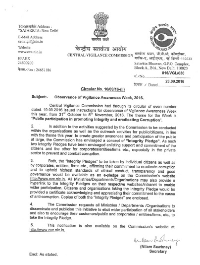 Observance of Vigilance Awareness Week 2016 - Concept of Integrity Pledge(CVC)